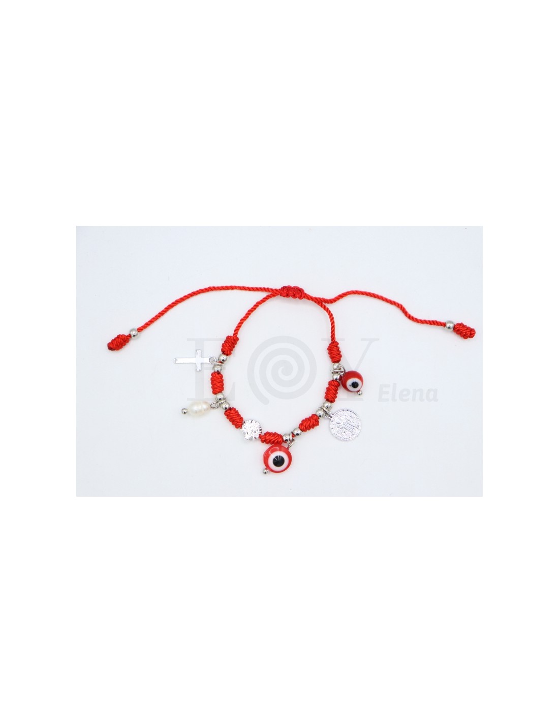 7-knot bracelet with Turkish evil eye, cross, Saint Benedict, tree, and pearl