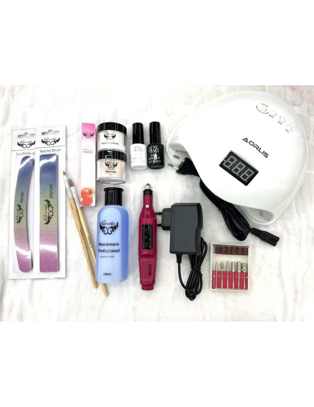48W lamp. 3,000-20,000 rpm lathe + milling cutter pack. 12ml top coat and base coat, 30g pink cover acrylic powder and 30g clear acrylic powder. 128ml bottle of monomer, 1 bottle of cuticle oil, 2 brushes, and 2 files.