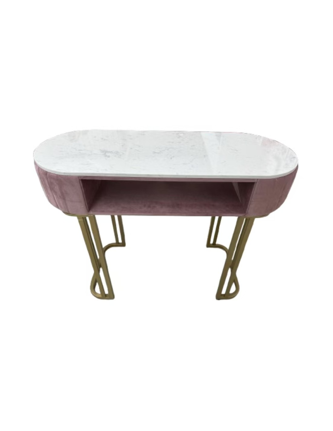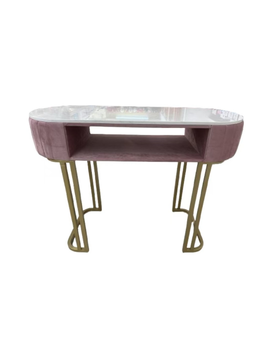 Mesa manicura rosada elegante, pata de metal dorada, suave tapizado en terciopelo rosado, un hueco para guarda lampara y herramientas.