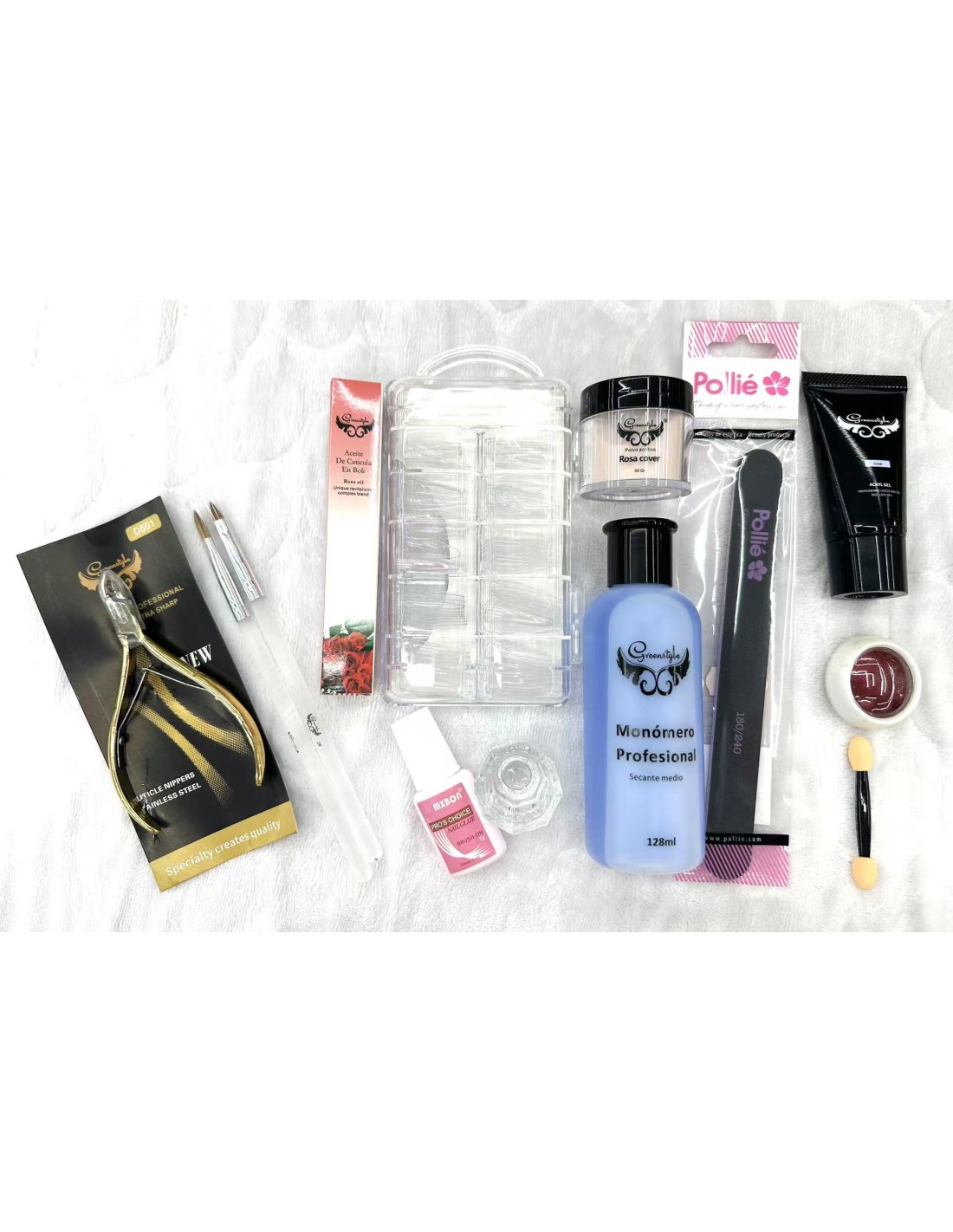 1 alicate, 2 pinceles acrilico, 1 aceite cuticula, 1 pegamento profesional, 1 caja tips, 1 vasito, 1 polvo acrilico de 30gr, 1 bote monomero de 128ml, 1 lima, 1 acri gel, 1 polvo espejo.