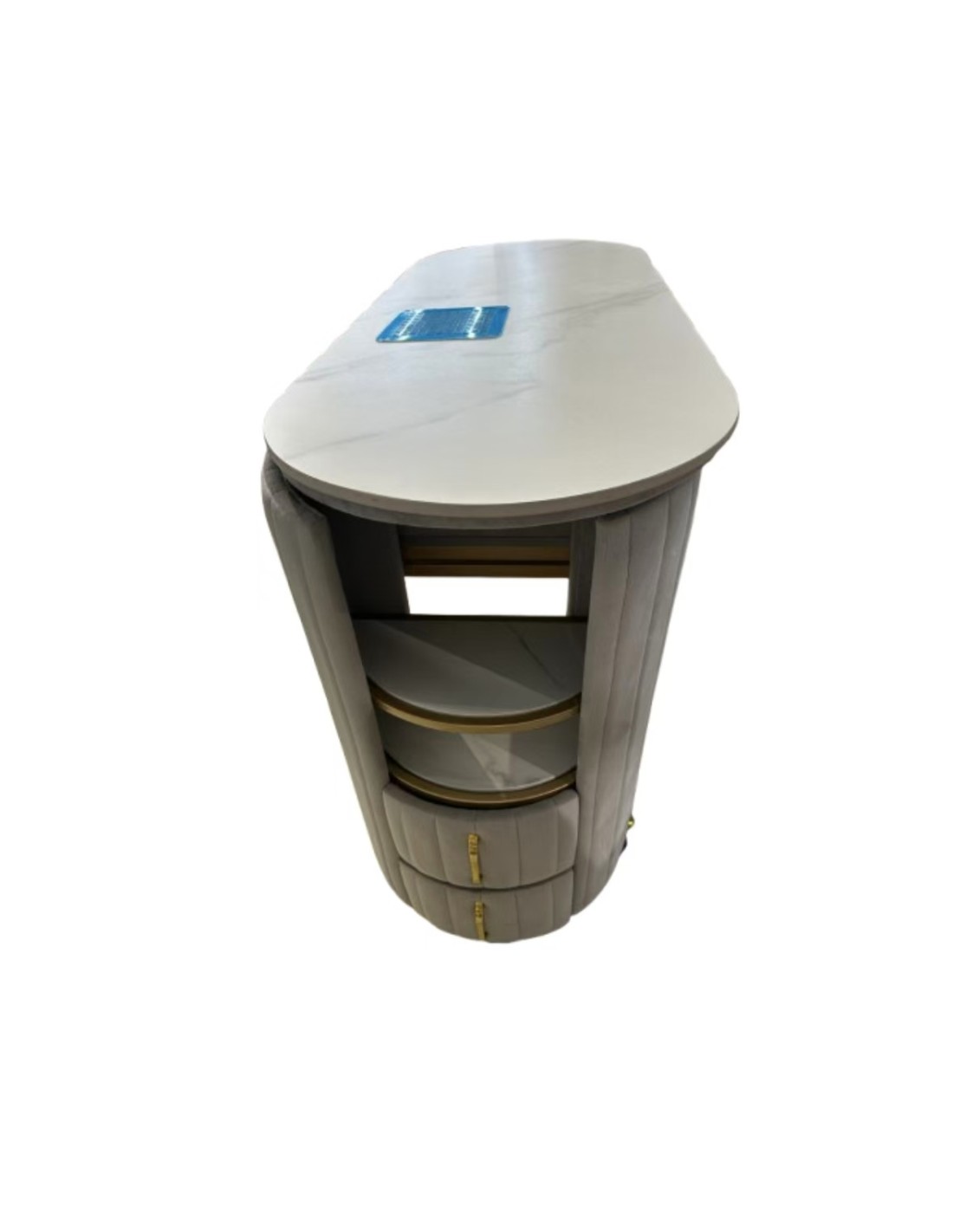Mesa manicura gris elegante, pata de metal dorada, suave tapizado en terciopelo gris, con un extractor , un hueco para guarda lampara. un cajon en la parte izquierda, en la parte derecha es individual , separa de la mesa. hay dos cajones y dos huecos para guarda la cosa. y viene con 4 ruedas montada facil de mover.